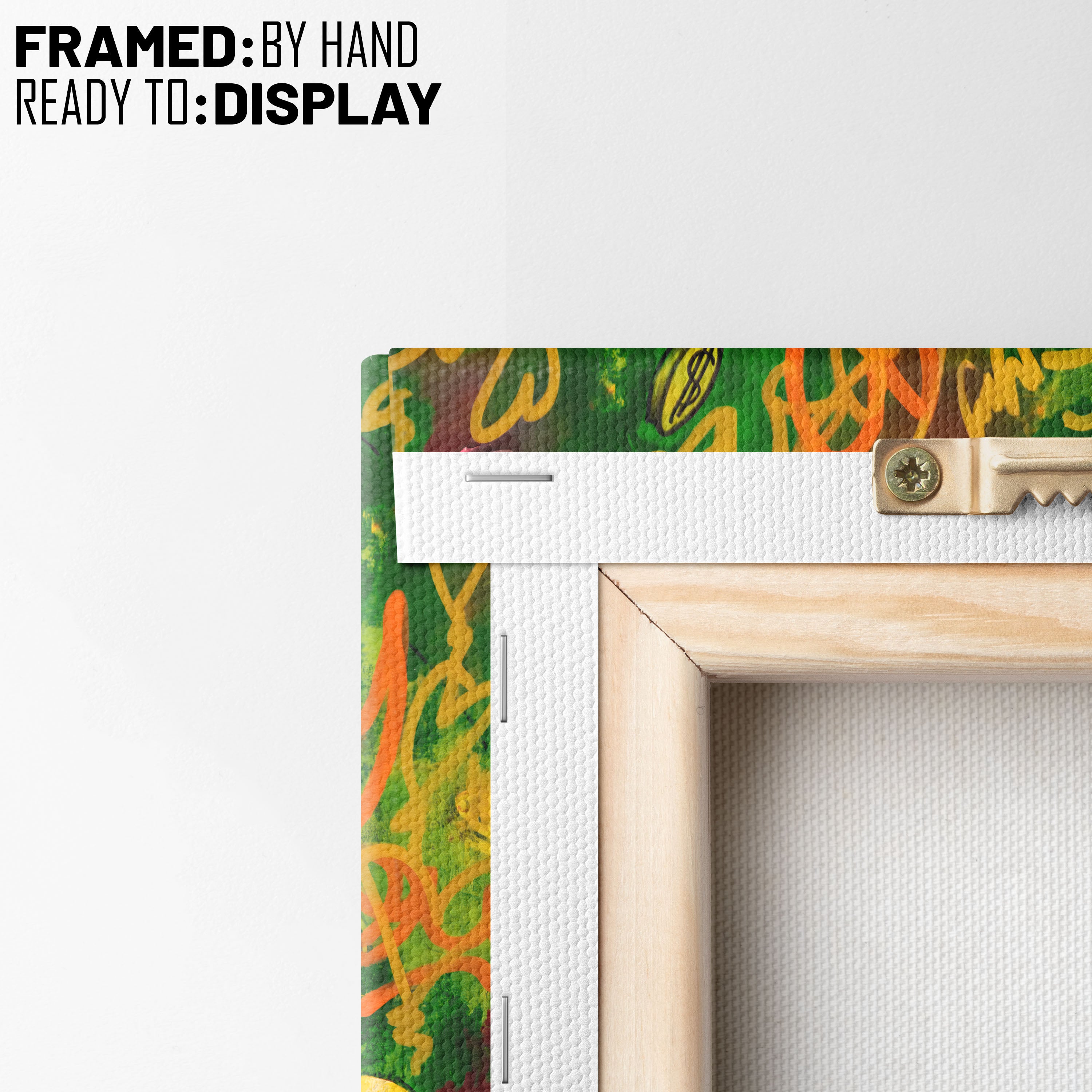 - Hang the canvas by placing the metal hanger on the nail.