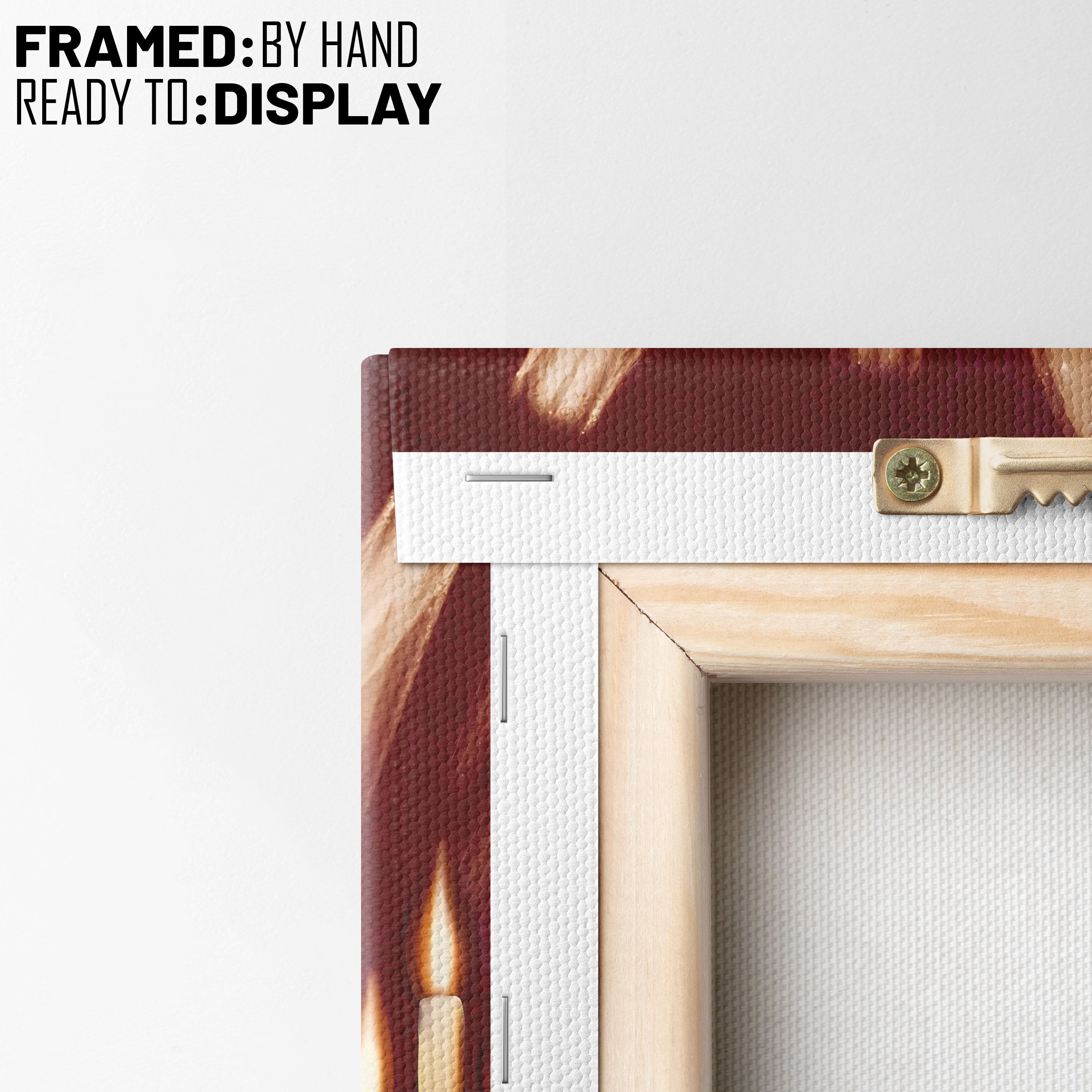 - Hang the canvas by placing the metal hanger on the nail.