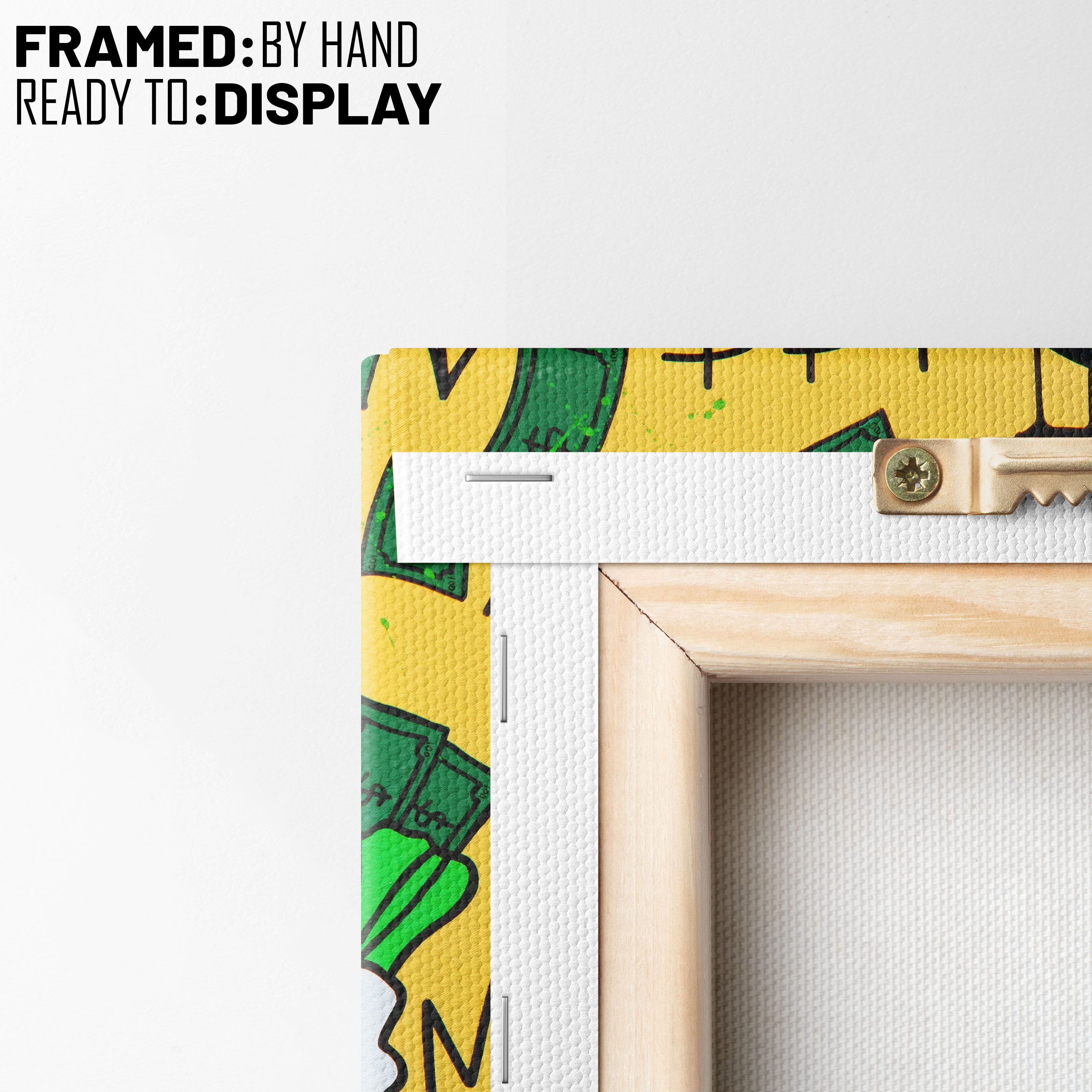 - Hang the canvas by placing the metal hanger on the nail.